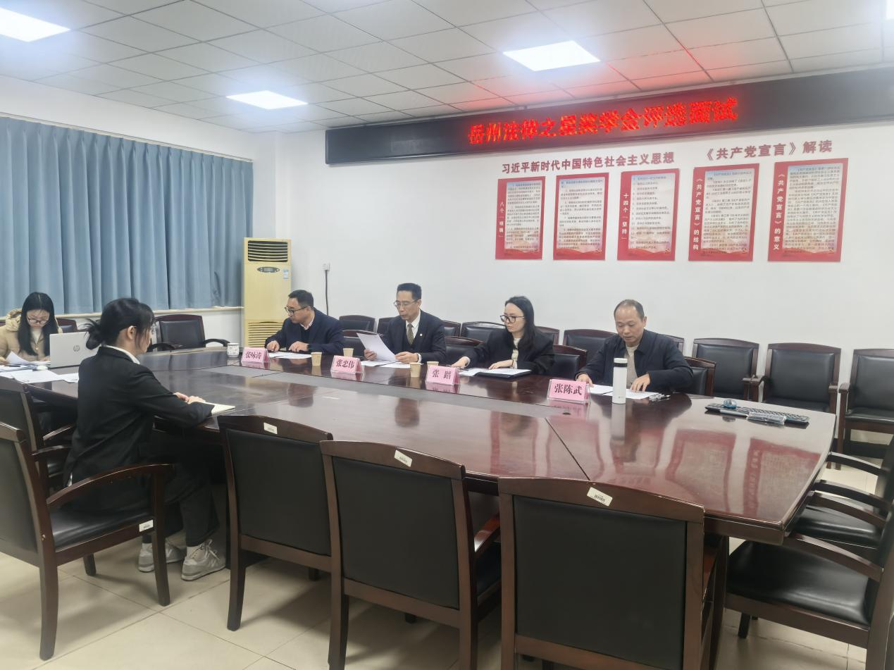 【本站讯】“岳州法律之星奖学金”由yl8cc永利官网与湖南岳州律师事务所联合设立,旨在通过校所合作搭建育人平台,鼓励法学学子深耕专业、锤炼本领,促进学生全面发展。为切实落实“岳州法律之星奖学金”激励导向,选拔专业扎实、全面发展的优秀法学学子,2025年12月3日,yl8cc永利官网联合湖南岳州律师事务所共同开展“岳州法律之星奖学金”评选面试。湖南岳州(岳阳)律师事务所主任张忠伟、律师张蹈,yl8cc永利官网党委副书记张陈武、党委委员张咏涛组成评审团,对经前期资格审查、筛选入围的24名候选学子进行综合考评。
