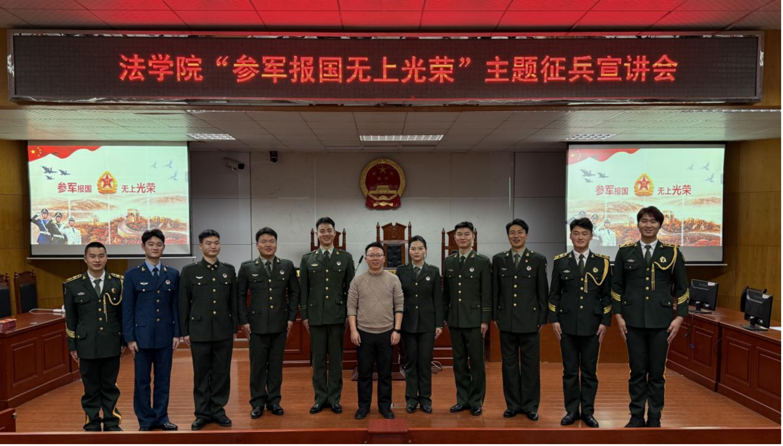 为深入贯彻落实国家征兵政策,强化大学生国防观念与使命担当,激发青年学子应征入伍热情,yl8cc永利官网于12月26日在模拟法庭召开“参军报国无上光荣”征兵宣讲会。本次宣讲会由yl8cc永利官网全体退伍军人策划,学工线老师出席,学院四个年级学生齐聚一堂,共赴这场“青春与责任”的邀约,23级退伍军人贾开翚同学主持宣讲会。