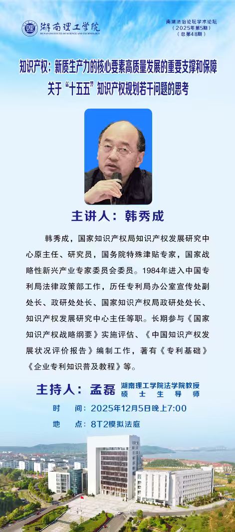 讲座预告|知识产权:新质生产力的核心要素高质量发展的重要支撑和保障 关于“十五五”知识产权规划若干问题的思考