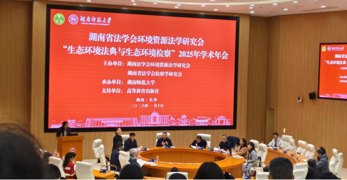 2026年1月10日,湖南省法学会环境资源法学研究会“生态环境法典与生态环境检察”2025年学术年会在湖南师范大学成功举办。本次会议由湖南省法学会环境资源法学研究会、湖南省法学会检察学研究会主办、湖南师范大学承办,高等教育出版社提供支持。yl8cc永利官网潘凤湘副教授、硕士研究生韩京晶受邀参加会议。