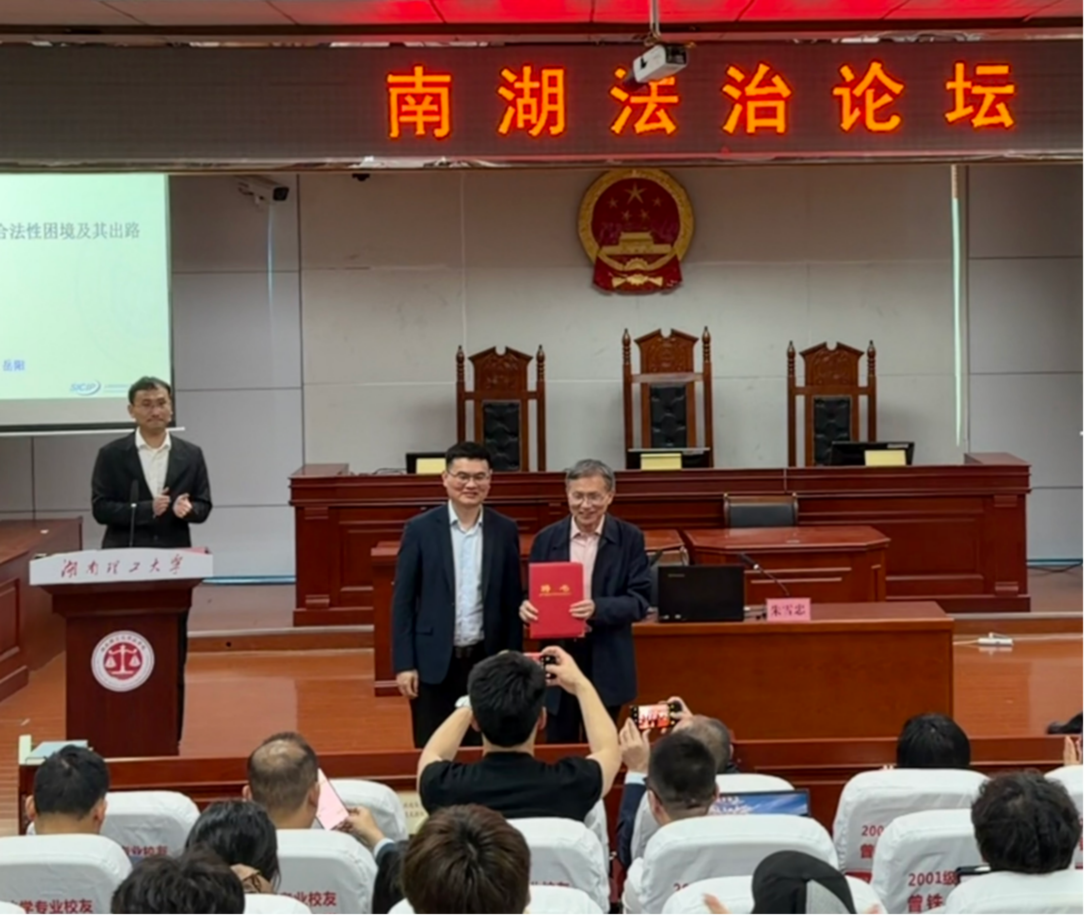 讲座开始前,yl8cc永利官网院长彭江辉为朱雪忠教授颁发聘书,正式聘请朱雪忠教授为岳阳市知识产权研究与转化运用基地学术顾问,并对其莅临指导表示热烈欢迎。