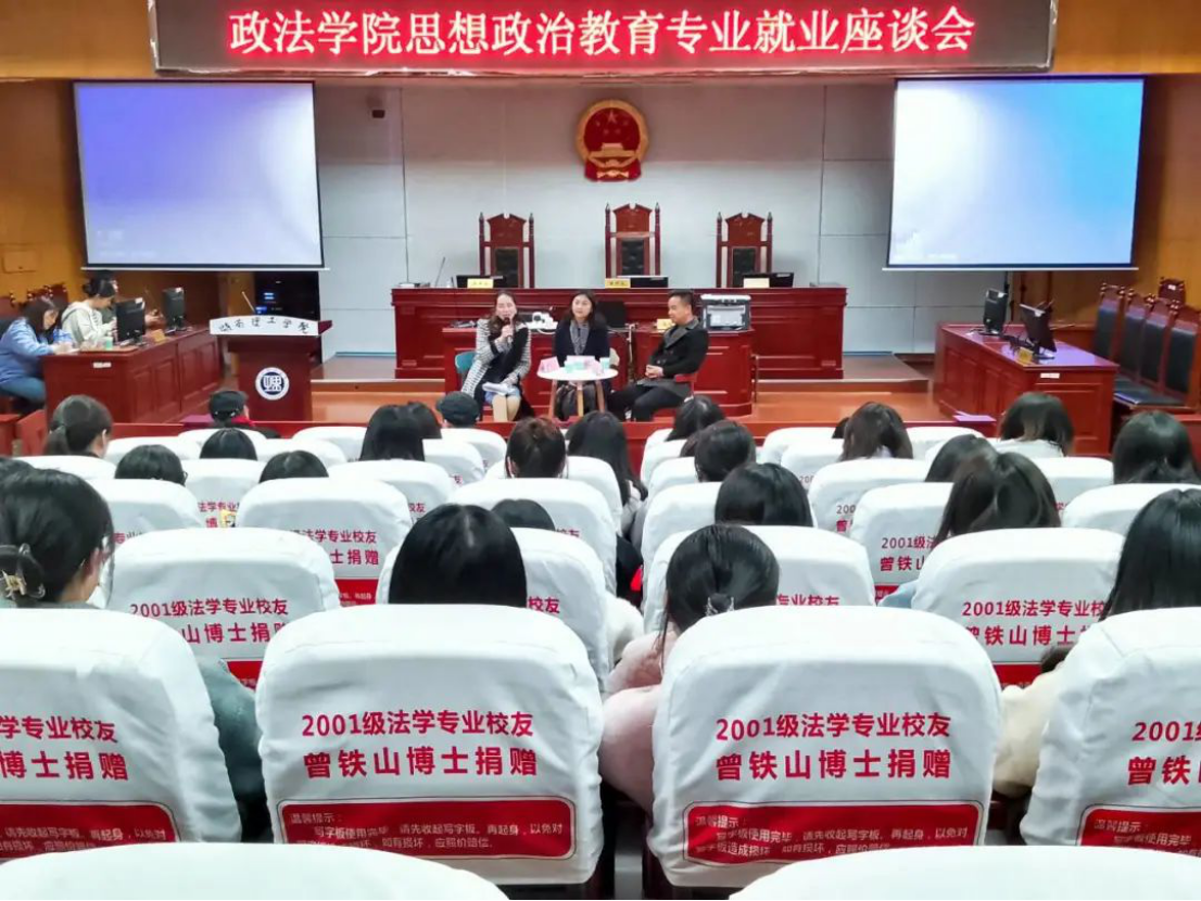 为帮助思政专业学生树立就业目标,更好地明确未来规划,夯实就业创业工作基础,11月23日晚七点,政yl8cc永利官网在八栋教学楼模拟法庭召开思想政治教育专业就业座谈会。政yl8cc永利官网团委书记魏嘉琦主持本次会议,思政专业往届优秀毕业生黄芳萍,胡涛,郭超颖担任主讲,政yl8cc永利官网党委副书记张陈武,思政专业教师徐雯雯出席本次会议,全体19级思政专业学生参加会议。